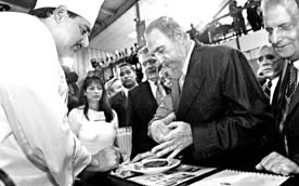El mandatario cubano examina una hamburguesa en un local de la feria agroalimentaria de productos de Estados Unidos inaugurada ayer en La Habana. ``Estas exhibiciones pueden ayudar a construir los vínculos entre los dos pueblos'', dijo FOTO AFP