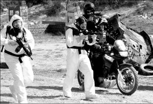 Policías israelíes con máscaras antigás se ejercitan en Beit Govring ante un posible ataque de Irak FOTO AFP