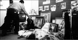 Un policía judicial coloca las obras de arte recuperadas al detener a una banda dedicada al robo a casas habitación en Valle de Bravo, coludida con empleadas domésticas FOTO MVT