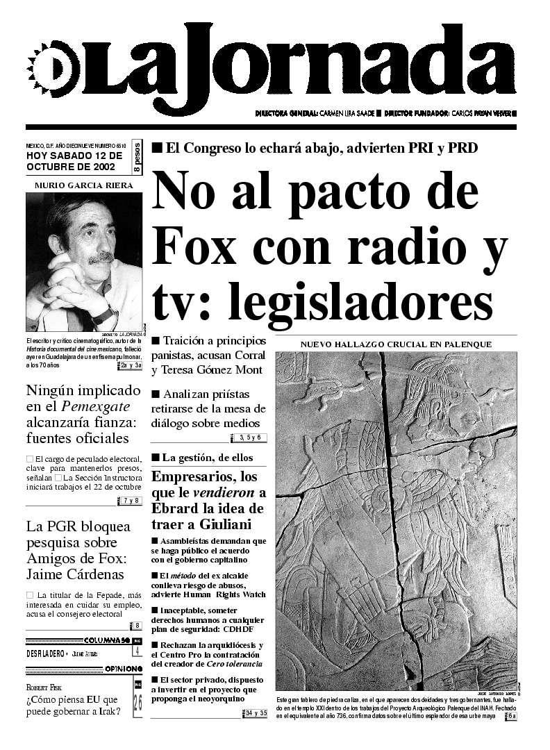 Este gran tablero de piedra caliza, en el que aparecen dos deidades y tres gobernantes, fue hallado en el templo XXI dentro de los trabajos del Proyecto Arqueológico Palenque del INAH. Fechado en el equivalente al año 736, confirma datos sobre el último esplendor de esa urbe maya FOTO JOSE ANTONIO LOPEZ