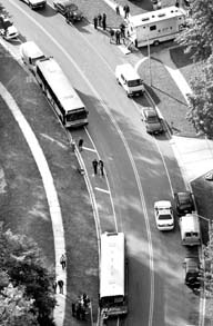 La policía examina la zona donde Conrad Johnson, chofer de un autobús (vehículo de la parte inferior), fue ultimado de un tiro en el pecho ayer en Silver Spring, a 20 kilómetros de Washington. También se divulgó un mensaje en el que el asesino dirigió amenazas contra niños FOTO REUTERS