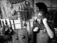 Un centurión se ajusta el casco antes de iniciar sus clases en la escuela de gladiadores, en las cercanías de Roma. A diferencia de sus antepasados sedientos de sangre, hace unos 2 mil años, los alumnos de este plantel rara vez se hacen daño cuando reviven las prácticas de aquellos tiempos FOTO REUTERS