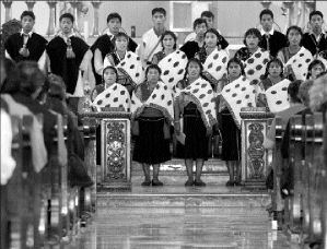 Muchachos y muchachas del Coro de Acteal, dirigidos por Roberto Pérez Sántiz, también pregonan: ''ese gringo no es el amo" y ''no basta rezar, ¡no, no, no!, hacen falta muchas cosas para conseguir la paz".