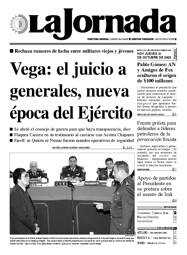 El ex comandante de la Policía Judicial Federal, Adrián Carrera Fuentes, escucha los reclamos del general Arturo Acosta Chaparro durante el careo que solicitó este último con el testigo protegido: ``dos veces el señor pretendió presentarme a una persona, de la cual ignoraba su nombre (se trataba de Amado Carrillo)'', dijo el militar. El ex jefe policiaco contestó: ``pues yo no recuerdo; ha pasado mucho tiempo'' FOTO MARCO PELAEZ