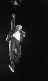 medio de un arnés y vuela sobre el auditorio. Le aplauden y le gritan