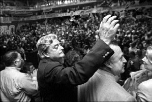 El ex presidente de Uruguay y líder del Partido Nacional (blanco), Luis Alberto Lacalle, en la convención que ayer confirmó la salida de la formación del gobierno de coalición del mandatario Hugo Batlle FOTO AFP