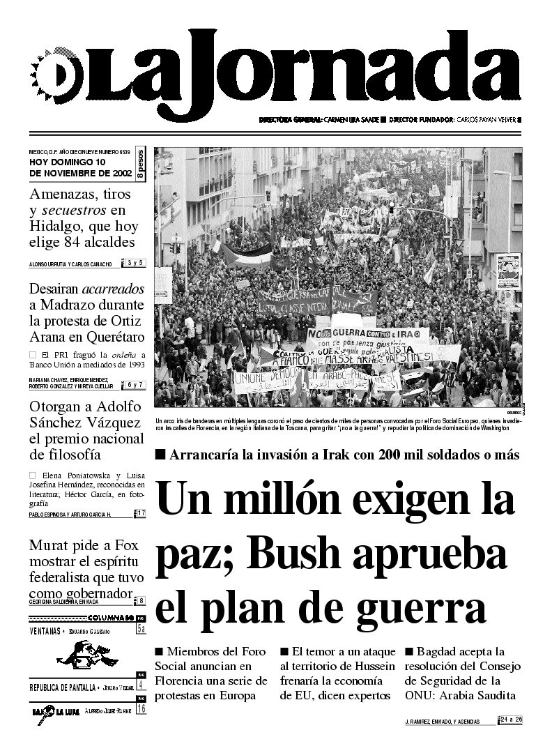 Un arco iris de banderas en múltiples lenguas coronó el paso de cientos de miles de personas convocadas por el Foro Social Europeo, quienes invadieron las calles de Florencia, en la región italiana de la Toscana, para gritar ``¡no a la guerra!'' y repudiar la política de dominación de Washington FOTO REUTERS