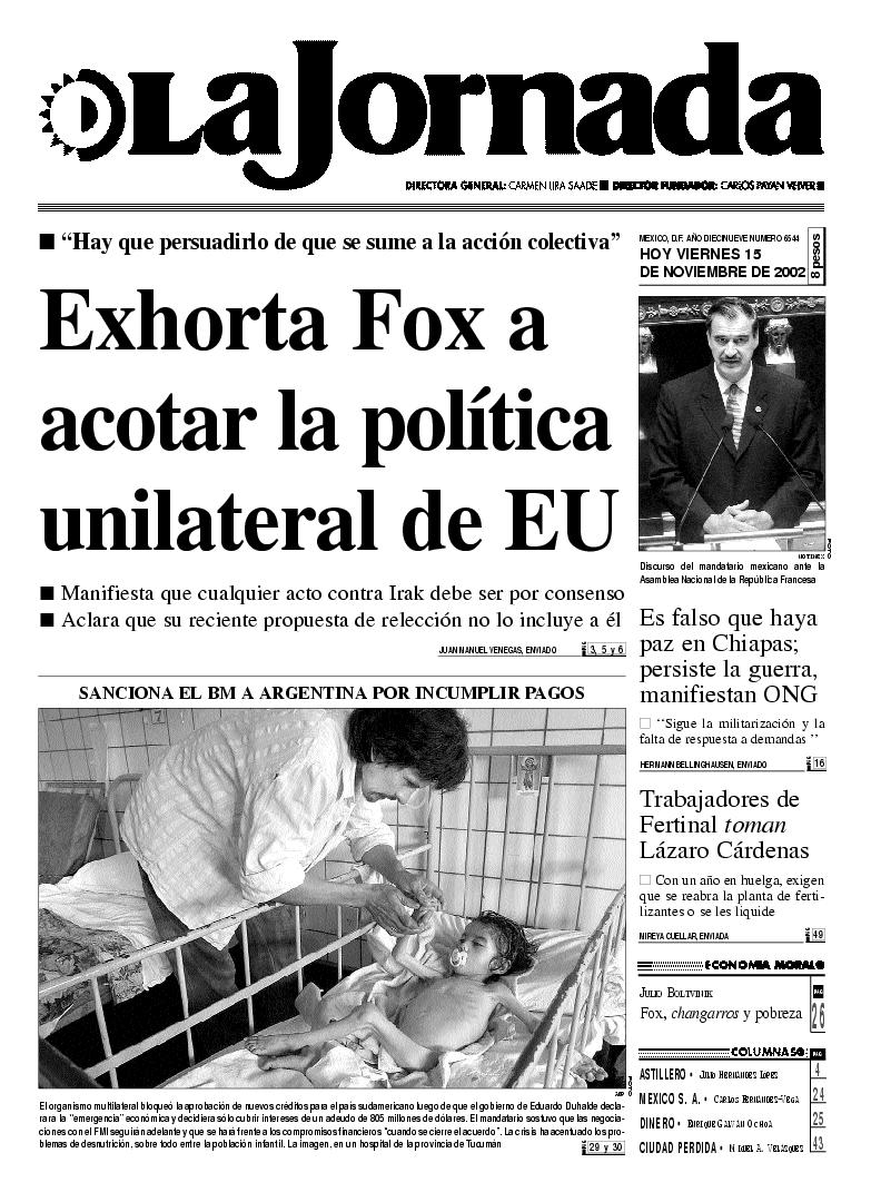 El organismo multilateral bloqueó la aprobación de nuevos créditos para el país sudamericano luego de que el gobierno de Eduardo Duhalde declarara la ``emergencia'' económica y decidiera sólo cubrir intereses de un adeudo de 805 millones de dólares. El mandatario sostuvo que las negociaciones con el FMI seguirán adelante y que se hará frente a los compromisos financieros ``cuando se cierre el acuerdo''. La crisis ha acentuado los problemas de desnutrición, sobre todo entre la población infantil. La imagen, en un hospital de la provincia de Tucumán FOTO AFP