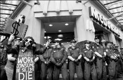 Policías resguardan un restaurante ante la marcha de protesta de activistas que rechazan la reunión de ministros de Economía de la Organización Mundial de Comercio, que se efectúa en Sydney, Australia FOTO REUTERS