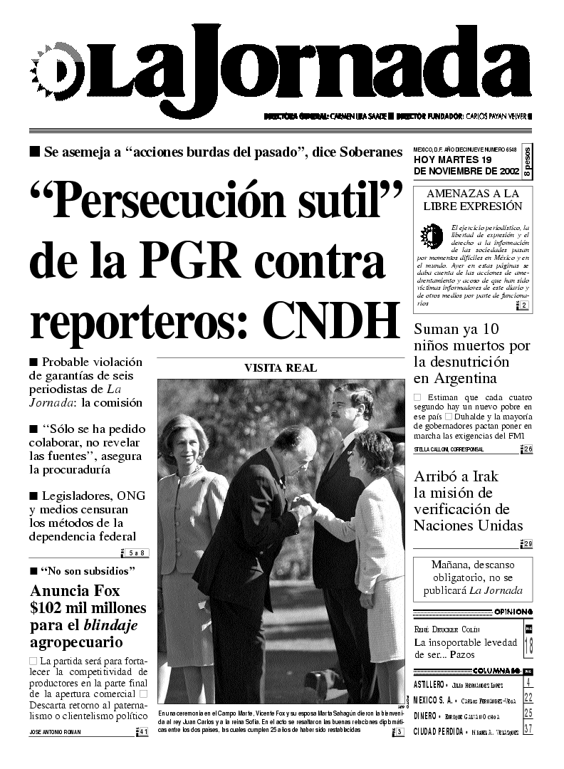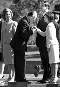 En una ceremonia en el Campo Marte, Vicente Fox y su esposa Marta Sahagún dieron la bienvenida al rey Juan Carlos y a la reina Sofia. En el acto se resaltaron las buenas relaciones diplomáticas entre los dos países, las cuales cumplen 25 años de haber sido restablecidas FOTO AFP