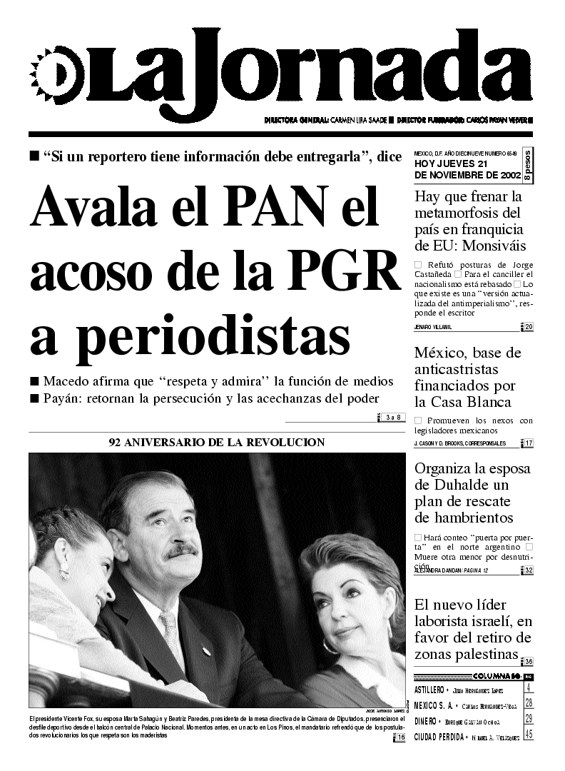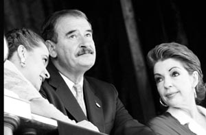 El presidente Vicente Fox, su esposa Marta Sahagún y Beatriz Paredes, presidenta de la mesa directiva de la Cámara de Diputados, presenciaron el desfile deportivo desde el balcón central de Palacio Nacional. Momentos antes, en un acto en Los Pinos, el mandatario refrendó que de los postulados revolucionarios los que respeta son los maderistas FOTO JOSE ANTONIO LOPEZ