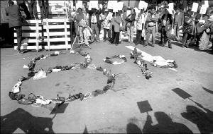 a con el índice a las curules de sus contrincantes políticos).
