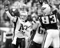 Por el aún campeón de la NFL, Tom Brady sumó 134 yardas al completar 14 de 29 envíos, incluido uno a manos enemigas. Antowain Smith apenas corrió para 31 yardas en seis intentos, mientras Troy Brown generó 73 en ocho atrapadas.