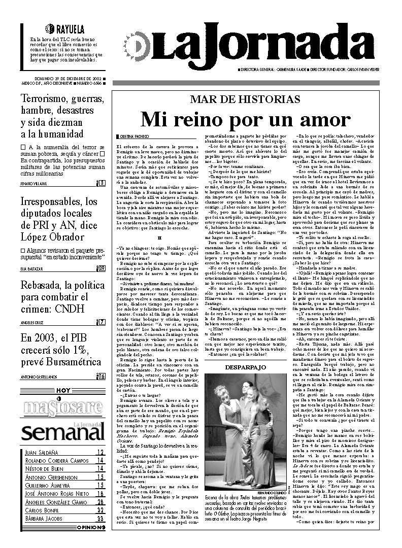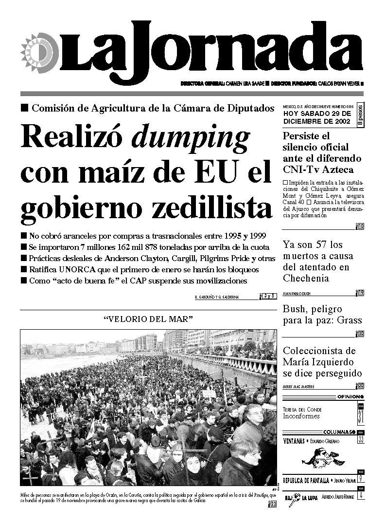 No cobró aranceles por compras a trasnacionales entre 1995 y 1999 Se importaron 7 millones 162 mil 878 toneladas por arriba de la cuota Prácticas desleales de Anderson Clayton, Cargill, Pilgrims Pride y otras Ratifica UNORCA que el primero de enero se harán los bloqueos Como ``acto de buena fe'' el CAP suspende sus movilizaciones