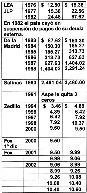 CUANDO LLEGUÉ A la frontera, hace unos días, el dólar se vendía en las casas de cambio a 10.30 pesos. El último día del año, de regreso al DF, costaba 10.60. Hace dos años, cuando el cambio de gobierno, que no es lo mismo que gobierno del cambio, valía 9.50. La devaluación de entonces a la fecha es de 1.10 pesos, es decir, 11.58 por ciento. A principios de 2000, la moneda nacional tuvo un repunte, se negoció en 8.99 por dólar. Luego vino un pronunciado deslizamiento. Algunos analistas consideran que este 2003 se devaluará al menos otro 10 por ciento, para acumular 20 por ciento en tres años. Ya duele. El siguiente cuadro muestra la trágica trayectoria de nuestra moneda de 1976 a la fecha.