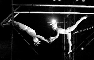 La trapecistas Anni Davey y Flee O'Brien realizan su acto durante la primera función de la temporada del Circo Oz en Sydney. La gira, que en seis meses tocó cinco ciudades, llegó a la capital australiana para inaugurar el foro Estado del arte, creado específicamente para albergar espectáculos circenses. El lugar tiene capacidad para mil 356 personas y su construcción costó 500 mil dólares FOTO AFP