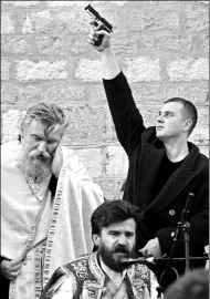 Un sacerdote ortodoxo se cubre la oreja mientras un hombre no identificado hace un disparo al aire durante las celebraciones de la Navidad ortodoxa, en Montenegro, ex Yugoslavia FOTO REUTERS