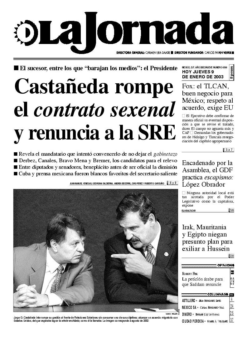 Jorge G. Castañeda interrumpe su gestión al frente de Relaciones Exteriores sin consumar uno de sus objetivos: alcanzar un acuerdo migratorio con Estados Unidos, del que esperaba lograr la whole enchilada, como él la llamaba. La imagen corresponde a agosto de 2002 FOTO MARCO PELAEZ