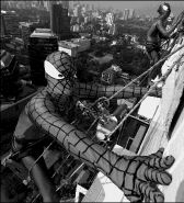 Unos hombres disfrazados de Hombre Araña trepan