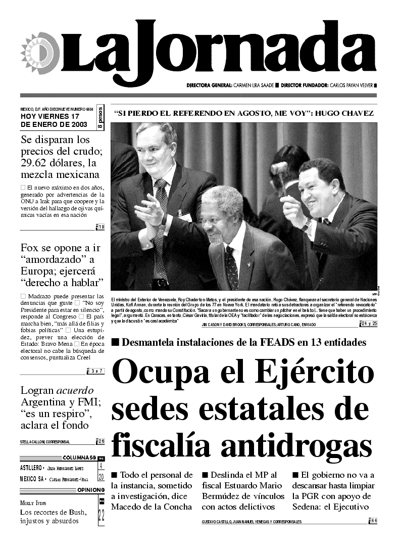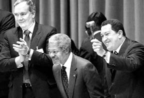 El ministro del Exterior de Venezuela, Roy Chaderton-Matos, y el presidente de esa nación, Hugo Chávez, flanquean al secretario general de Naciones Unidas, Kofi Annan, durante la reunión del Grupo de los 77 en Nueva York. El mandatario retó a sus detractores a organizar el ``referendo revocatorio'' a partir de agosto, como manda su Constitución. ``Sacar a un gobernante no es como cambiar un pitcher en el beisbol... tiene que haber un procedimiento legal'', argumentó. En Caracas, en tanto, César Gaviria, titular de la OEA y ``facilitador'' de las negociaciones, expresó que la salida electoral no está cerca y que la discusión ``es casi académica'' FOTO AFP