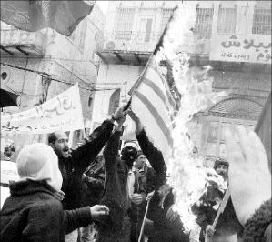 Palestinos queman en Nablus una bandera estadunidense en repudio a una agresión a Irak FOTO AFP