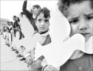 Niños paquistaníes cargan palomas de papel, símbolo de la paz, durante una cadena humana formada en Rawalpindi para rechazar los aprestos bélicos de Washington contra Bagdad FOTO AFP