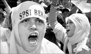 Frente al palacio presidencial de Yakarta, mujeres indonesias protestan por el reciente y brusco aumento en los precios de la gasolina, las tarifas telefónicas y de electricidad FOTO REUTERS