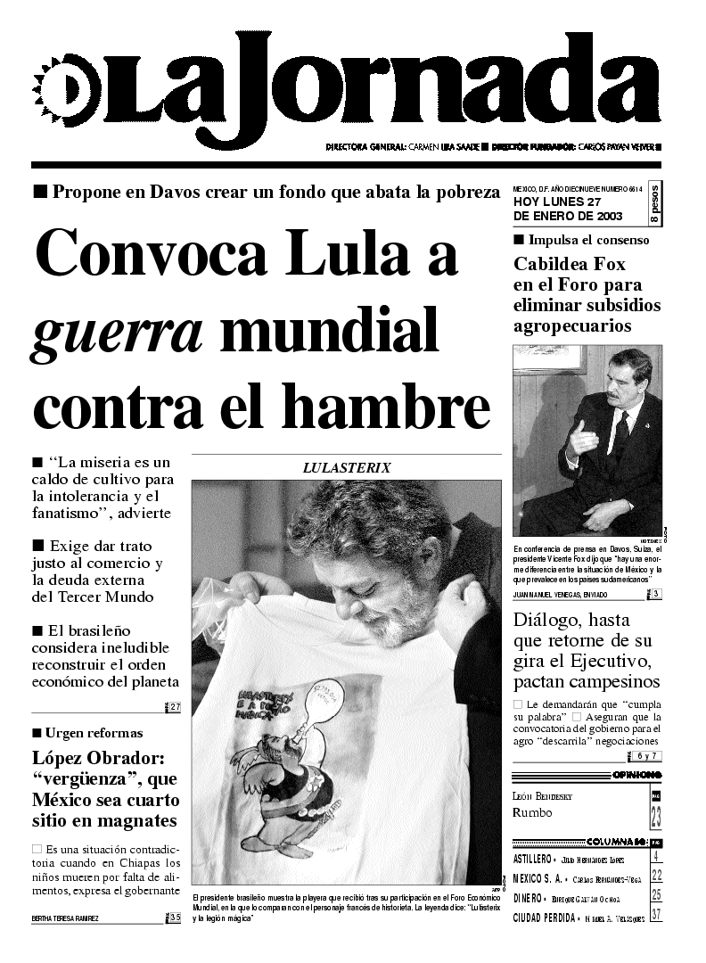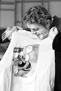 El presidente brasileño muestra la playera que recibió tras su participación en el Foro Económico Mundial, en la que lo comparan con el personaje francés de historieta. La leyenda dice: ``Lulásterix y la legión mágica'' FOTO AFP