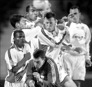 Hanno Balitsch, del Bayer Leverkusen, se coloca enfrente de la barrera del Energie Cottbus, en duelo de la Bundesliga FOTO REUTERS