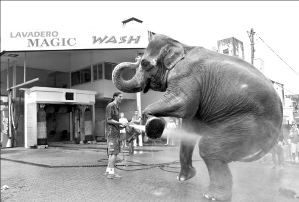 Prises, una elefanta india de 26 años, es bañada por su entrenador Eziel en un lavado de autos de Montevideo, Uruguay. Prises y Eziel trabajan en el circo brasileño Beto Carrero FOTO REUTERS