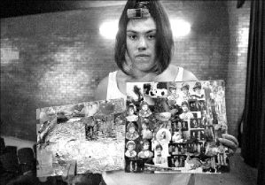 EXPOSICION PENITENCIARIA  Gloria, interna del reclusorio de Tepepan, muestra los collages con los que participó en la exposicion-venta de pintura Matices de libertad, para mujeres presas de la República Mexicana FOTO JOSE ANTONIO LOPEZ