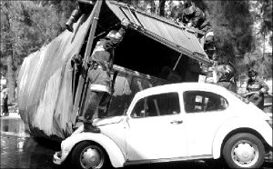 PERCANCE EN IZTACALCO  Un camión que transportaba frutas volcó y cayó sobre un Volkswagen sedán, en la calle Añil FOTO CARLOS CISNEROS