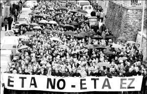 La manifestación recorrió las calles de esa ciudad de la provincia de Guipúzcoa en total silencio, y durante la misma los participantes portaron pancartas en las que se leía la consigna "ETA no".