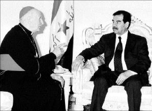 "Esta hostilidad se desencadena contra Irak sobre la base de excusas sin fundamento, pese a que Irak no tiene armas de destrucción masiva, y en momentos en que Israel posee todo tipo de armas de destrucción masiva, mata palestinos desarmados y destruye sus casas", dijo el gobernante al cardenal visitante.