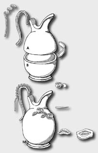 *Las piezas A y B se hacen en molde, se orean y por medio de una banda de barro de 2 cm de ancho se unen; a esta operación se le llama fajar *Las flores se forjan a mano y se adhieren al cuerpo de la jarra mediante una porción de barro. *Con pequeños rodillos (con un extremo un poco más delgado) se hacen los tallos de las rosas. *Las hojas se elaboran en molde, y se pegan a la jarra, ondulándo las para que tengan movimiento. |
