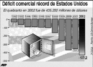 El déficit global estadunidense derivó de exportaciones de bienes y servicios por 973 mil millones de dólares, en tanto que las importaciones fueron por 1.4 billones de dólares (millones de millones) a lo largo de 2002.