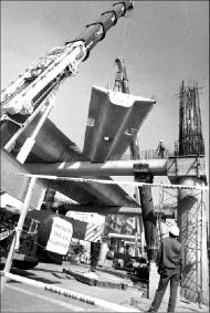 Trabajadores colocan una plataforma del distribuidor vial San Antonio FOTO ROBERTO GARCIA ORTIZ