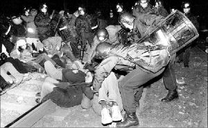 al forcejear policías con pa-cifistas que intentaban bloquear las