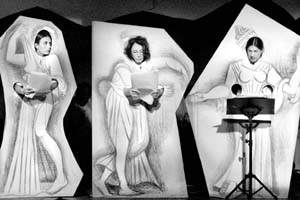 Sasha Sokol, Isela Vega y Jesusa Rodríguez en la representación en el jardín Centenario de Coyoacán, con escenografía de Gonzalo Rocha, monero de La Jornada. La obra también fue ayer escenificada por los reconocidos actores Julie Christie, Vanessa Redgrave y Kevin Bacon en Los Angeles, Londres y Brooklyn, respectivamente. La comedia de Aristófanes fue leida en 59 países -en Estados Unidos hubo actos en todo su territorio- y en las principales lenguas de la Tierra FOTO CRISTINA RODRIGUEZ
