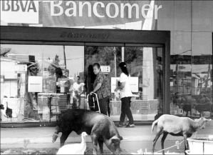 Para eludir el excremento de un cerdo, cuatro gallos, tres guajolotes y un chivo, los clientes evitan la entrada principal a la sucursal e ingresan por la puerta del cajero automático, no sin dejar de hacer comentarios sobre la innovada granja citadina.