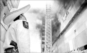 Un elemento de la Policía Típica observa el humo que sale del inmueble, en ruinas, donde estuvo el hotel Alameda, donde ayer hubo un conato de incendio FOTO CARLOS RAMOS MAMAHUA