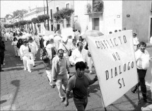 Cientos de profesores marcharon ayer por las principales calles de la ciudad de Tlaxcala en favor de la paz mundial y contra la guerra FOTO PEDRO PARDO