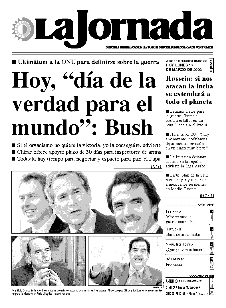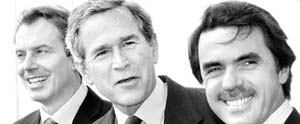 Tony Blair, George Bush y José María Aznar durante su encuentro de ayer en las islas Azores. Abajo, Jacques Chirac y Saddam Hussein en entrevistas para la televisión en París y Bagdad, respectivamente FOTOS REUTERS Y AFP