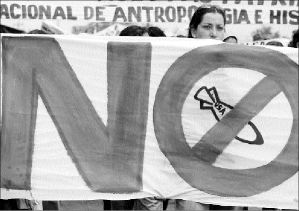 Estudiantes de la Escuela Nacional de Antropología e Historia junto con indígenas totonacas marcharon ayer en Papantla contra la Cumbre Tajín 2003 y la invasión estadunidense en Irak FOTO CRISTINA RODRIGUEZ