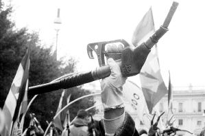 La manifestación en Roma estuvo dividida. Una fue organizada por el movimiento pacifista y la otra por la oposición de El Olivo. Los reportes hablan de 70 mil personas que salieron a las calles de la capital italiana, una cifra nada menor después de los 300 mil que lo hicieron el viernes. También en esa ciudad, un grupo de activistas de Greenpeace logró trepar a la cúspide del Altar a la Patria y desplegar desde ahí una bandera negra con una consigna antibélica y un retrato de Berlusconi tocado con un casco como el empleado por el ejército fascista de Benito Mussolini.