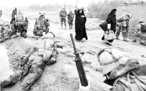 Mujeres iraquíes son desalojadas por marines estadunidenses tras enfrentamientos con tropas del gobierno de Saddam Hussein cerca de la ciudad norteña de Nasiriya. Docenas de helicópteros de ataque Apache y Black Hawk volaron hacia el norte mientras las fuerzas angloestadunidenses continuaron ayer su avance hacia Bagdad FOTO AFP
