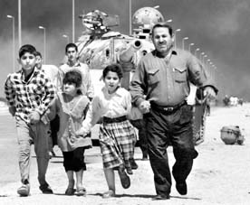 Una familia intenta huir de los combates y la crisis humanitaria que azotan Basora. Oficiales del ejército británico informaron que fuerzas iraquíes dispararon contra más de dos mil civiles que buscaban salir de la región FOTO REUTERS
