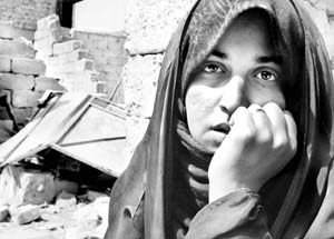 Una mujer permanece frente a los restos de su casa, destruida durante un ataque de la aviación angloestadunidense en las afueras de Bagdad. Los jefes militares de los bandos en guerra llevaron la confrontación bélica al plano de la propaganda con reportes contradictorios sobre la ubicación de las tropas invasoras respecto a la capital iraquí. El Pentágono habla de 25 kilómetros, Irak de 80 FOTO FALEH KHEIBER /REUTERS