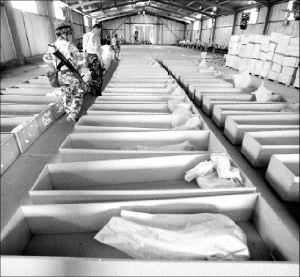 Militares británicos observan restos humanos y ataúdes que hallaron en una instalación abandonada en el sur de Irak. A la derecha, el iraquí Hafid Katham, de 39 años, aguarda ser atendido de las graves quemaduras en cara y manos que sufrió durante los bombardeos angloestadunidenses en Nasiriya. Katham dijo ayer que en el ataque que lo dañó, hace 13 días, perdió a 11 familiares FOTOS REUTERS
