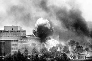 Una bomba estalla en las cercanías del Ministerio de Información tras incrementarse los ataques a oficinas gubernamentales y cuarteles de la Guardia Republicana, en Bagdad. Según mandos británicos, la ciudad de Basora ``fue liberada'' y es presa de saqueos FOTO REUTERS